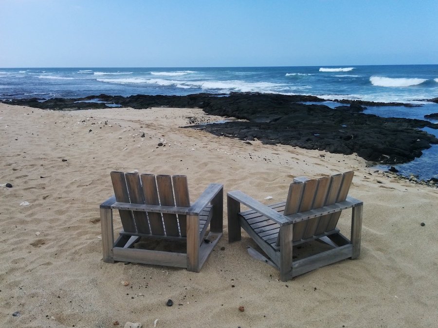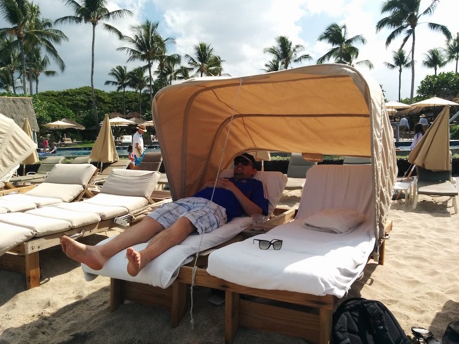 Big Island, North Kona, HawaiiMais j’avoue que le cadre en valait la chandelle. Notre balade dans le resort nous a laissé sans voix, époustouflés par les piscines tous les 10 mètres, un cadre relaxant, une plage magnifique, etc… Nous avons squatté des chaises longues haut confort au bord de l’océan, en pensant que ça y est, nous étions riches ! Pourquoi pas une petite balade en yacht cet après-midi ? On pourrait prendre l’hélico et le jet ski pour s’amuser… Le rêve s’est très vite évanoui quand des employés de l’hôtel nous ont gentiment invité à quitter les lieux ! Retour à la réalité. On n’est pas là pour siroter des sodas sur un double coussin à l’ombre d’un éventail à regarder l’horizon !