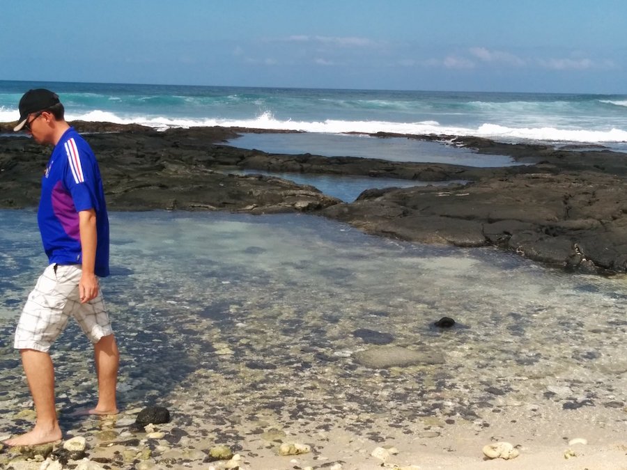 Big Island, North Kona, HawaiiNous nous sommes ensuite rendus à Puako, tout au bout du village, là où se sont formées des piscines naturelles dans la lave. Dans certaines assez grandes, nous avons pu photographier de magnifiques poissons, nageant dans l’eau transparente. Nous nous sommes assoupis quelques minutes, avant que l’océan nous réveille en venant remplir de quelques centimètres notre piscine… Assez pour nous mouiller ! C’était marée haute. Heureusement, elle n’est pas aussi forte que sur les bords de l’Atlantique en Europe.