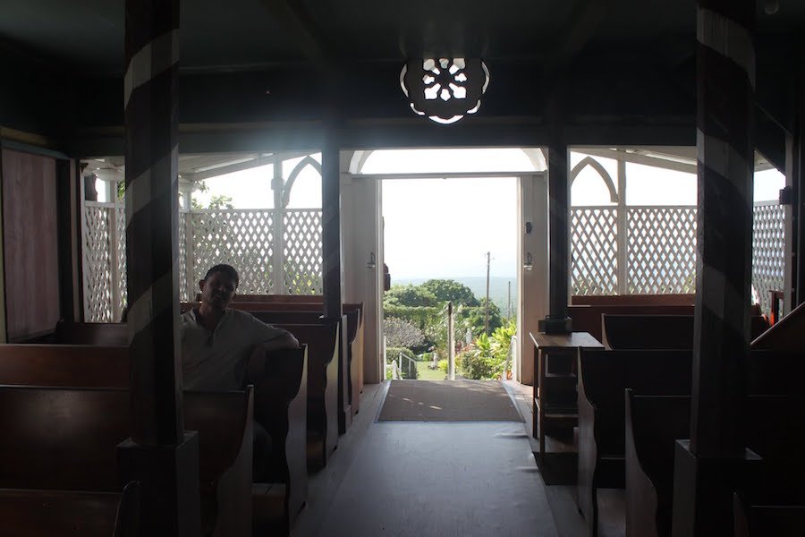 Big Island, Captain Cook, HawaiiNous avons continué par la visite de la painting church, une église peu commune pour nous. Petite église entièrement peinte en trompe l’œil, elle comporte une partie ouverte vers l’extérieur qui donne sur l’océan. On se croirait à Notre Dame… Jusqu’à ce qu’on lève la tête pour apercevoir les palmiers et le ciel bleu, à la sauce hawaïenne !